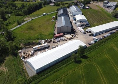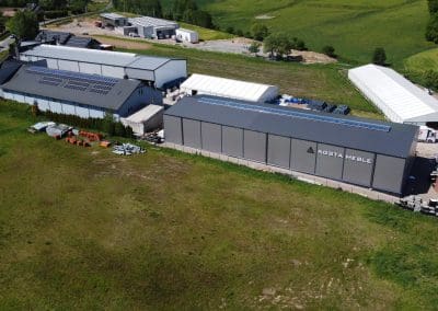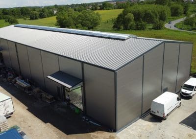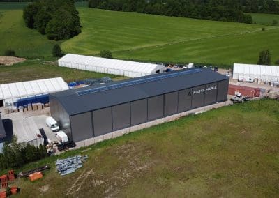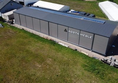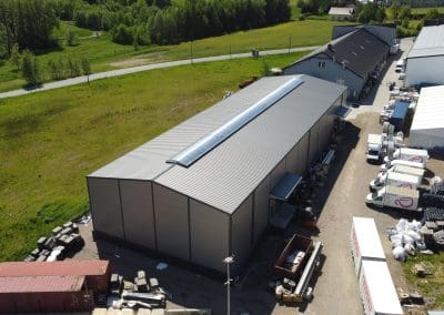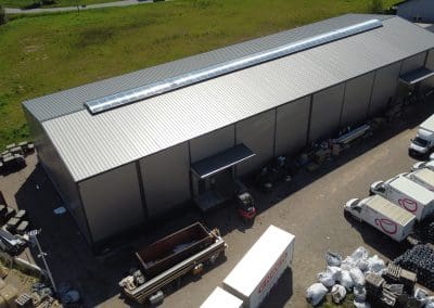 Konstrukcja hali słupowo-ryglowa jednonawowa o wymiarach 20x60x8 metrów. Poszycie; ściany – płyta warstwowa PIR-S 100 mm, natomiast dach – płyta warstwowa PIR-D 120mm. Świetlik kalenicowy o wielkości 3×50 plus klapy przewietrzające. Ponadto zamontowano dwie bramy z napędem elektrycznym oraz kompletne orynnowanie.