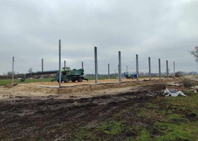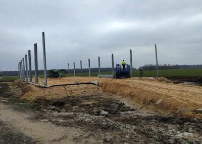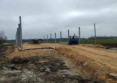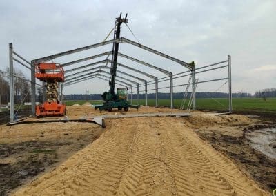 Kolejna realizacja – konstrukcja hali słupowo-ryglowa bez ściągu i bez podpór w środku, zabezpieczona antykorozyjnie przez ocynkowanie ogniowe, klasa korozyjności C3, pochylenie połaci dachowej 18º.