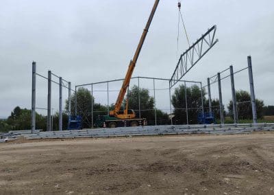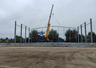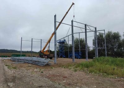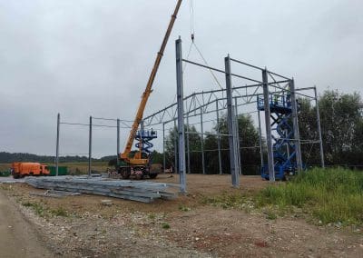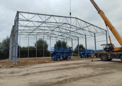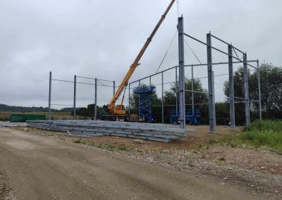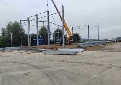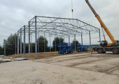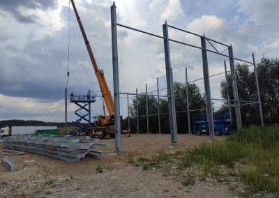 Obecnie kończymy montaż w okolicach Rzeszowa. Konstrukcja hali słupowo-kratowa o wymiarach 30x25x9,75 metrów. Kąt pochylenia dachu 7°. Wykonanie konstrukcji w klasie EXC2 zgodnie z normą PN-EN 1090-2. Zabezpieczenie konstrukcji poprzez cynkowanie ogniowe. Kolejnym etapem, który rozpocznie się w najbliższy tygodniu to montaż odbudowy hali ścian i dachu blachą trapezową. W ostatnim etapie prac zamotujemy bramy oraz komplet orynnowania wraz z obróbkami blacharskimi.