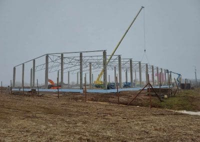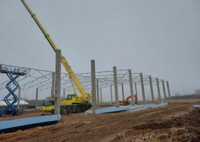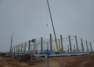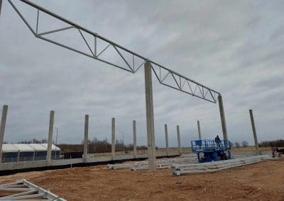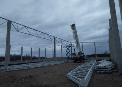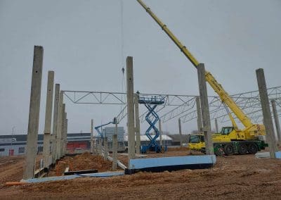 Kolejna inwestycja – budowa hali usługowej o wymiarach 40x65x10,87 z wewnętrznym torem kartingowym. Obecnie jesteśmy na etapie montaż konstrukcji dachu zaprojektowanego jako układ wiązarów stalowych podpartych główną ramą hali opartej na słupach żelbetowych. Ramy główne – wiązary kratowe stalowe przegubowo oparte na słupach żelbetowych. Pasy górne i dolne wiązarów wykonane z kształtowników dwuteowych, wykratowanie z profili rurowych, całość elementu wykonana ze stali S355JR.