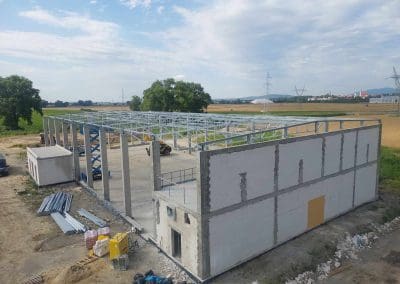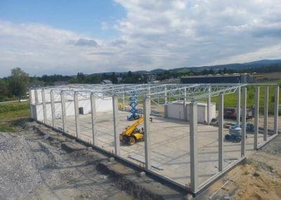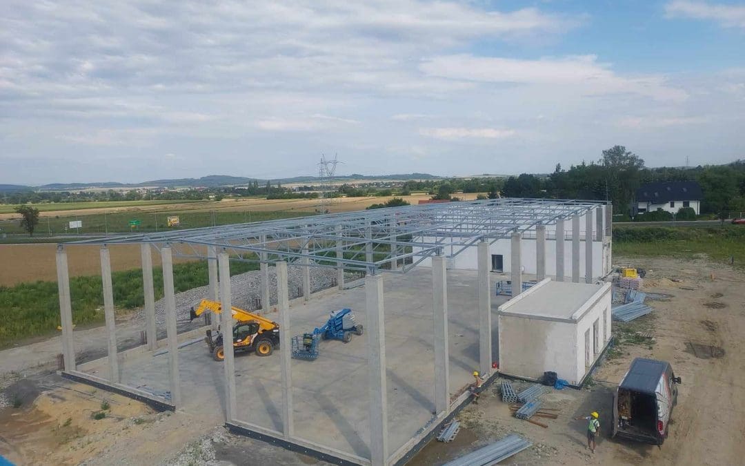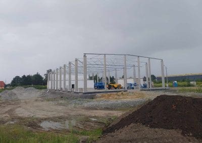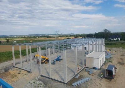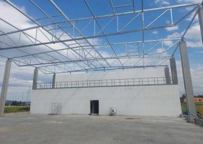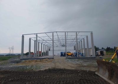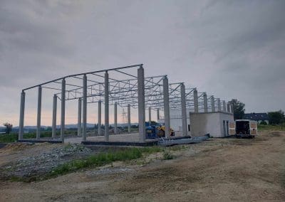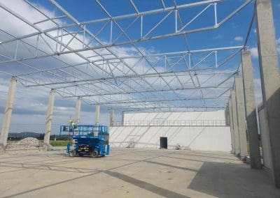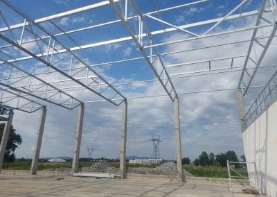 Kolejne zlecenie to wykonanie i montaż konstrukcji stalowej dachu w okolicach Wrocławia o wymiarach 24×54 metrów. Klasa wykonania konstrukcji według wymagań normy PN-EN 1090 – EXC2. Dach dwuspadowy o koncie nachylenia 2,86°. Zabezpieczenie antykorozyjne konstrukcji stalowej poprzez ocynkowanie ogniowe.