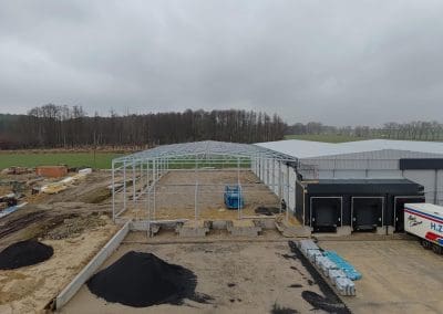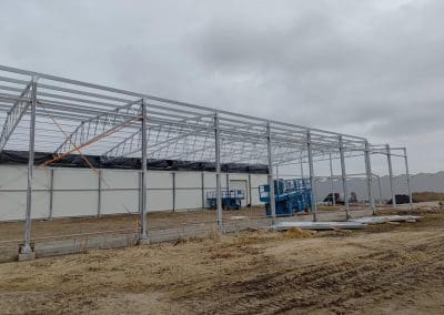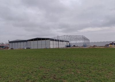 Aktualnie kończymy montaż konstrukcji stalowej w okolicach Zielonej Góry. Konstrukcja zabezpieczona antykorozyjnie poprzez ocynkowanie ogniowe. Pochylenie połaci dachowej 5,71°. Konstrukcja hali słupowo-kratownicowa o wymiarach 23x45x6 metrów. Budynek z przeznaczeniem na długoterminowe magazynowanie roślin. Ponadto na etapie projektowania zwrócono uwagę na umiejscowienie konstrukcji doków spedycyjnych w obiekcie, co przełoży się w przyszłość na sprawną obsługę stref załadunkowych. Również wzięliśmy pod uwagę, że bramy wjazdowe są stale otwierane i zamykane, dlatego mają bezpośredni wpływ na warunki środowiskowe wewnątrz hali. Zatem ustalono z klientem kierunek dominujących wiatrów w celu ograniczenia problemów powodowanych przez warunki pogodowe.