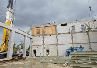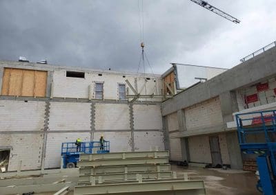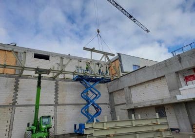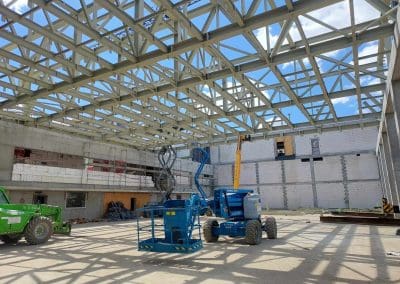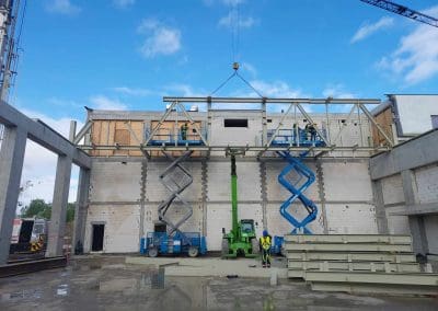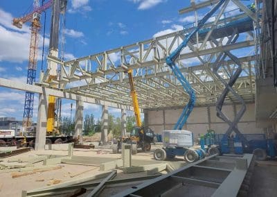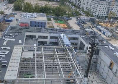 Mamy zaszczyt uczestniczyć w budowie kompleksu oświatowego w Ursusie. Będzie to szkoła z biblioteką w skrzydle budynku oraz przedszkole w osobnym budynku. Przy tym obiekcie powstanie także kompleks sportowy na terenie zewnętrznym i bardzo duża, prawie 1100-metrowa hala sportowa o wysokości 6,5 m. Montaż ponad 210 ton konstrukcji stalowej, w tym 34 tonowego dźwigara o wymiarach 5,20×25,02 metrów.