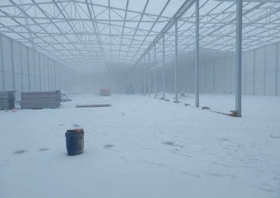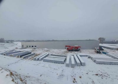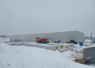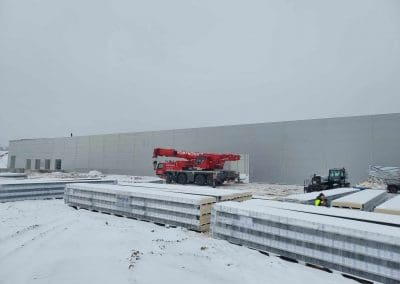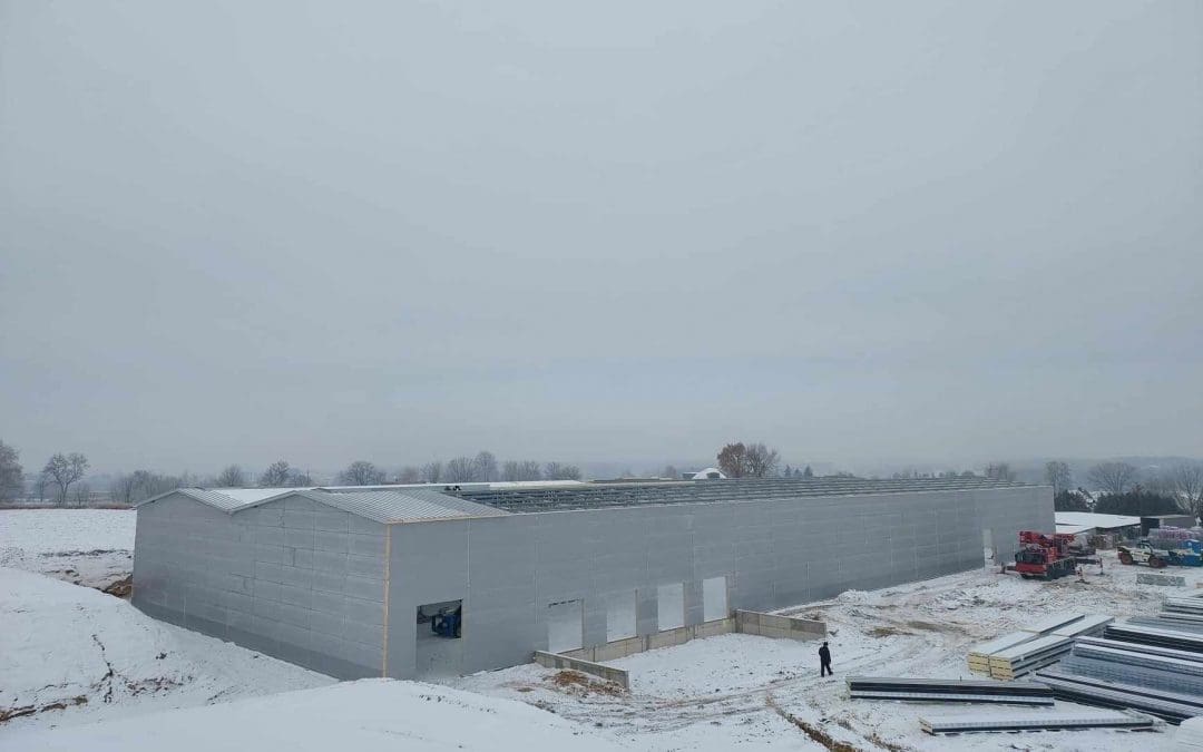Kolejny etap prac – montaż płyt dachowych. Płyty warstwowe są powszechnie stosowanym materiałem budowlanym do lekkiej obudowy hal przemysłowych, magazynowych, produkcyjnych, obiektów handlowych, biurowych, budynków administracyjnych, mroźni, chłodni. Montaż lekkiej obudowy może odbywać się niemal w każdych warunkach atmosferycznych.