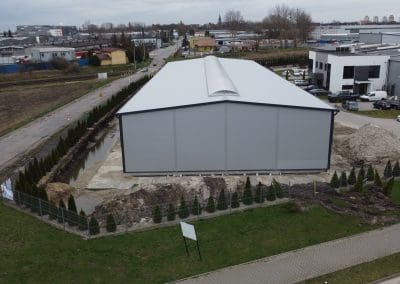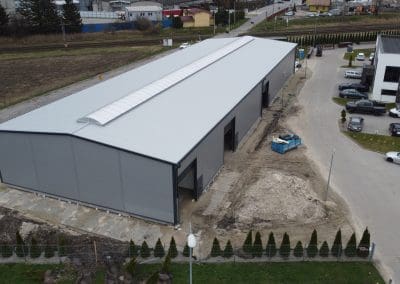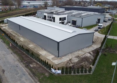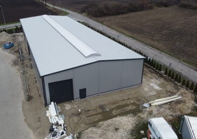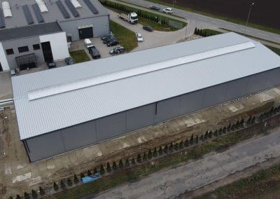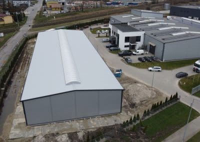 Konstrukcja hali słupowo-ryglowa o wymiarach 20x60x6 bez ściągu, z dwiema ścianami działowymi zabezpieczona antykorozyjnie przez ocynk ogniowy, pochylenie połaci dachowej 10º. Poszycie ścian to płyta warstwowa z rdzeniem PIR 120 mm w układzie poziomym. Poszycie dachu – płyta warstwowa z rdzeniem PIR 145 mm. Ponadto świetlik kalenicowy łukowy o wymiarach 3mx55m. Dodatkowo zamontowano bramy segmentowe z napędem elektrycznym 4m x 4m w liczbie czterech sztuk.