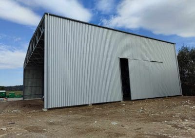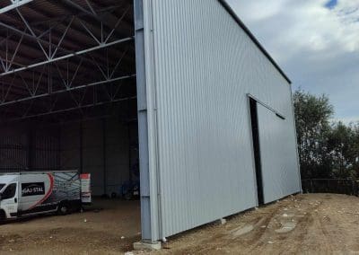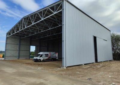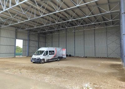 Konstrukcja hali słupowo-kratowa o wymiarach 30x25x9,75 metrów. Kąt pochylenia dachu 7°. Wykonanie konstrukcji w klasie EXC2 zgodnie z normą PN-EN 1090-2 oraz zabezpieczenie konstrukcji poprzez cynkowanie ogniowe zgodnie z normą PN-EN ISO 1461. Poszycie ścian i dachu – blacha trapezowa T-35 0,7mm. Komplet orynnowania stalowego cechujący się trwałość i wytrzymałość, w tym na zaleganie śniegu, gwałtowne opady deszczu, silny wiatr czy gwałtowne zmiany temperatury. System jest odporny na działanie wysokich i niskich temperatur, co zmniejsza ryzyko rozszczelnienia czy nawet pęknięć. Ponadto zamontowano dwie bramy przesuwne z wypełnieniem z blachy trapezowej T-35 o wymiarach 4,8×5,00 metrów.