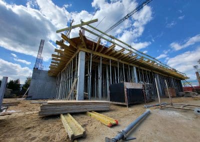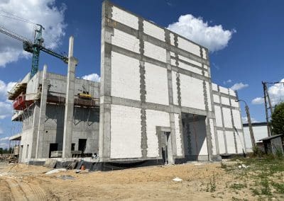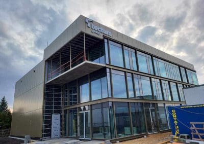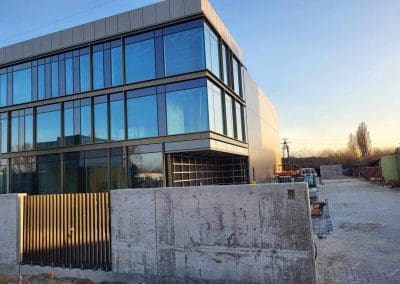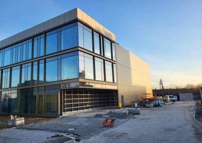 Działka, na której powstał budynek ma powierzchnię ponad 3000m2, a budynek został zlokalizowany w centralnej części działki. Powierzchnia użytkowa budynków to 1230m2. Główna bryła budynku to 3-kondygnacyjna część biurowa zintegrowana z halą magazynową o powierzchni 600m2. Dach płaski nad częścią biurową został docieplony termoizolacją PIR oraz dwoma warstwami papy, natomiast konstrukcja hali magazynowej została przykryta blachą trapezową, na którą instalowano termoizolację PIR, a następnie membranę FPO o grubości 2,0 mm.